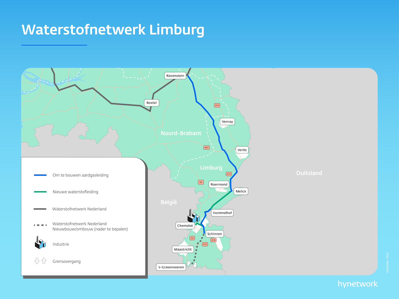 De Rijksoverheid werkt samen met Hynetwork aan de bouw van een nieuw waterstofnetwerk. Naar verwachting wordt na 2030 gestart met de aanleg van dit netwerk. Het gaat om het Waterstofnetwerk Limburg. Hierbij wordt een nieuwe ondergrondse waterstofleiding gemaakt van Ravenstein in Noord-Brabant naar Schinnen in Zuid-Limburg. Er komt ook een aansluiting naar de industrie op Chemelot.