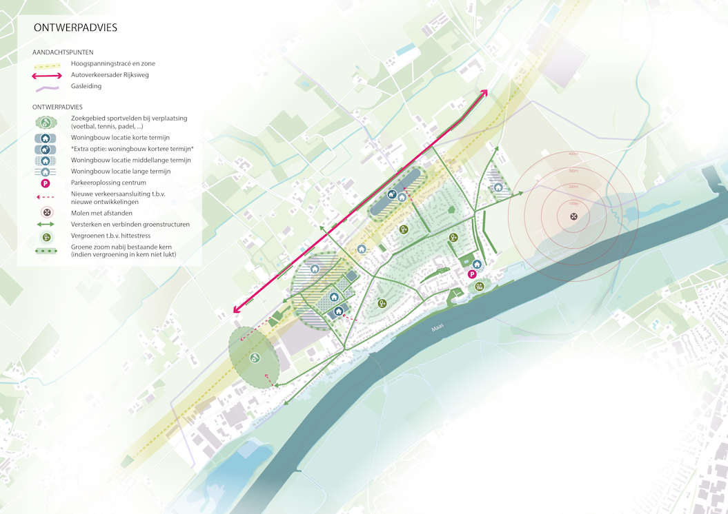 Er zijn verschillende scenario’s uitgewerkt. Per scenario is bekeken welke kansen en mogelijkheden dit biedt en wat de plussen en minnen zijn. Dit heeft geleid tot een voorkeursscenario. Volgens dit scenario wordt een nieuw sportpark voor voetbal en tennis aangelegd bij het bedrijventerrein, komen er woningen op de plek waar nu de voetbalvelden liggen en een combinatie van parkeren, wonen en groen op de huidige plek van de tennisvereniging. De omgeving van de Ondersteweg kan een geschikte plek zijn voor de molen. Ook zijn andere mogelijkheden voor woningbouw in beeld gebracht, voor de korte en de langere termijn. Daarbij is ook gekeken naar extra mogelijkheden die ontstaan als de hoogspanningslijn op enig moment wordt verplaatst.